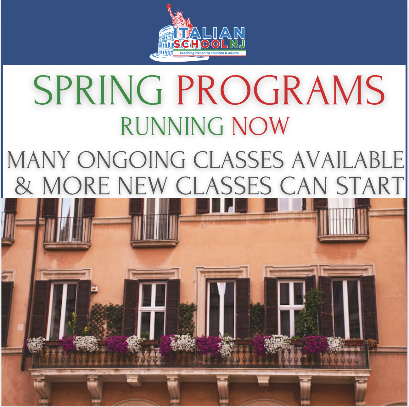 As a 501(c)3 not-for-profit Italian language and culture school, we are proud to offer group classes in our office located on 49 Ridgedale Avenue in East Hanover, NJ and online.